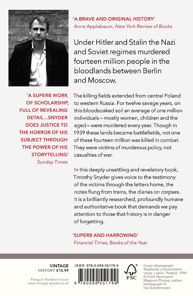 A powerful and revelatory history book about the bloodlands - the lands that lie between Stalin's Russia and Hitler's Germany - where 14 million people were killed during the years 1933 - 1944. In the middle of Europe, in the middle of the twentieth century, the Nazi and Soviet regimes murdered fourteen million people in the bloodlands between Berlin and Moscow. In a twelve-year-period, in these killing fields - today's Ukraine, Belarus, Poland, Western Russia and the eastern Baltic coast - an average of more than one million citizens were slaughtered every year, as a result of deliberate policies unrelated to combat.