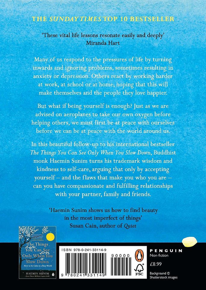In this beautiful follow-up to his international bestseller The Things You Can See Only When You Slow Down, Buddhist monk Haemin Sunim turns his trademark wisdom and kindness to self-care, arguing that only by accepting yourself - and the flaws which make you who you are - can you have compassionate and fulfilling relationships with your partner, family and friends.