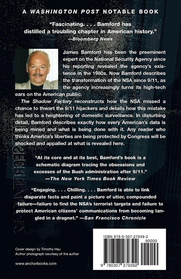 'The Shadow Factory' reconstructs how the NSA missed a chance to thwart the 9/11 hijackers and details how this mistake has led to a heightening of domestic surveillance. In disturbing detail, Bamford describes exactly how every American’s data is being mined and what is being done with it. Any reader who thinks America’s liberties are being protected by Congress will be shocked and appalled at what is revealed here.