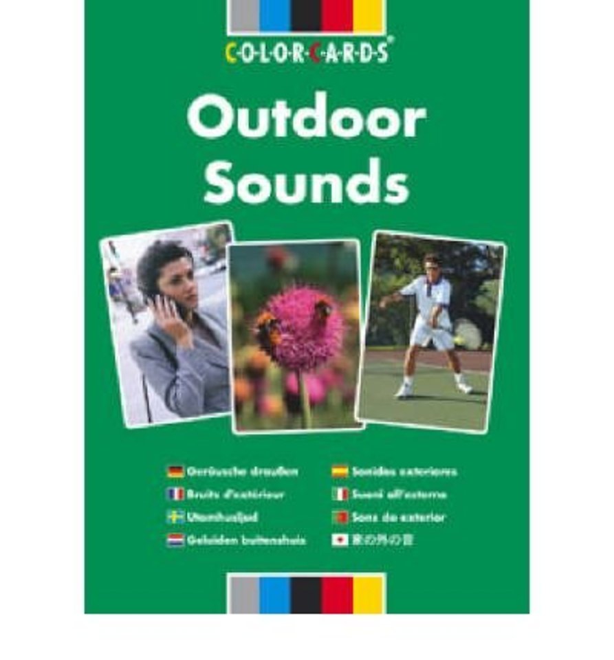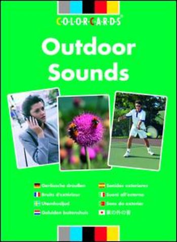 "Outdoor Sounds" is a sound and picture matching activity. It offers 40 cards and sounds to enhance language development. Arranged in four groups of ten, this set includes forty commonly heard sounds. New cards and sounds include: mobile phone, car alarm and skateboarding; animals & birds - bee, sheep, ducks, horse; out & about - traffic, mower, waves, car alarm; having fun - fireworks, tennis, swimming; and, transport - car, train, aeroplane, helicopter.
