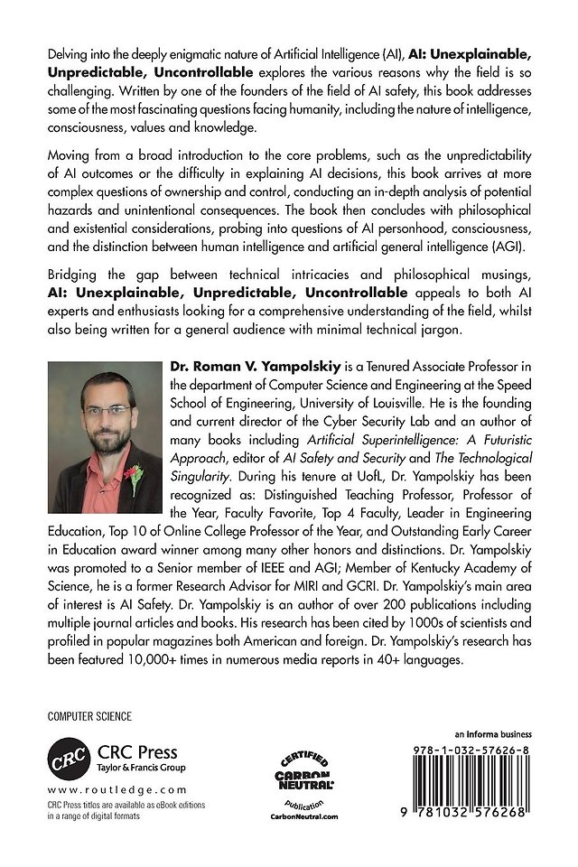 Delving into the deeply enigmatic nature of Artificial Intelligence (AI), ‘AI: Unpredictable, Unexplainable, Uncontrollable’ explores the various reasons why the field is so challenging. Written by one of the founders of the field of AI safety, this book addresses some of the most fascinating questions facing humanity, including the nature of Intelligence, Consciousness, Values and Knowledge.