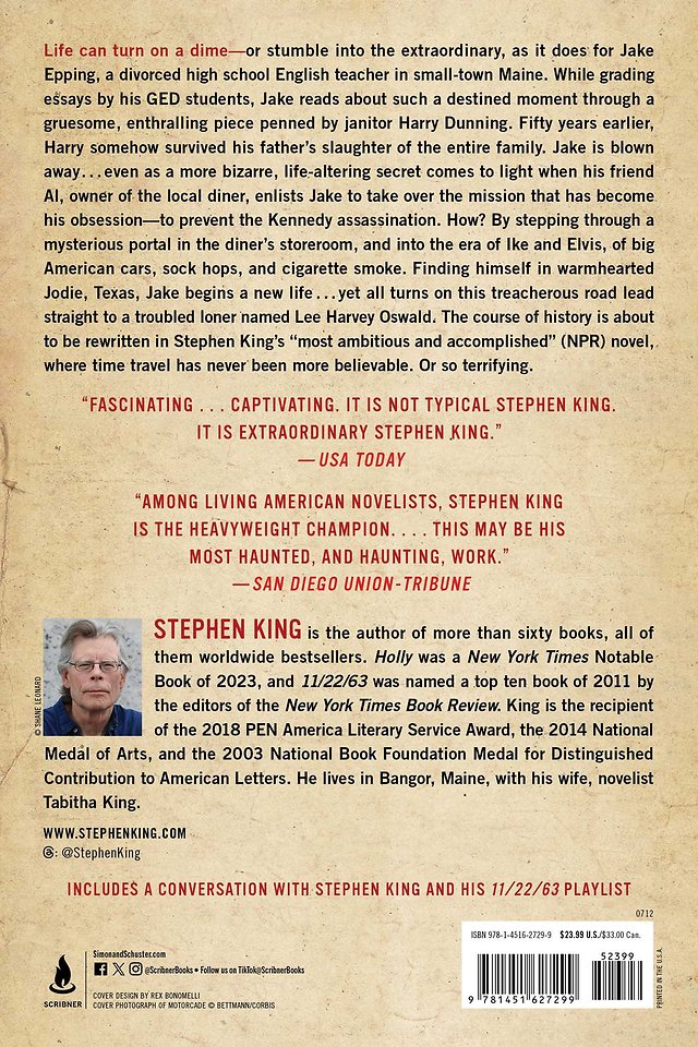 On November 22, 1963, three shots rang out in Dallas, President Kennedy died, and the world changed. What if you could change it back? In this brilliantly conceived tour de force, Stephen King—who has absorbed the social, political, and popular culture of his generation more imaginatively and thoroughly than any other writer—takes readers on an incredible journey into the past and the possibility of altering it.
