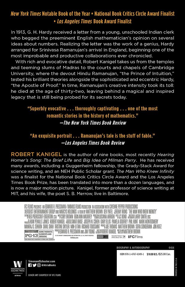 Thus began one of the most improbable and productive collaborations ever chronicled. With a passion for rich and evocative detail, Robert Kanigel takes us from the temples and slums of Madras to the courts and chapels of Cambridge University, where the devout Hindu Ramanujan, "the Prince of Intuition," tested his brilliant theories alongside the sophisticated and eccentric Hardy, "the Apostle of Proof."