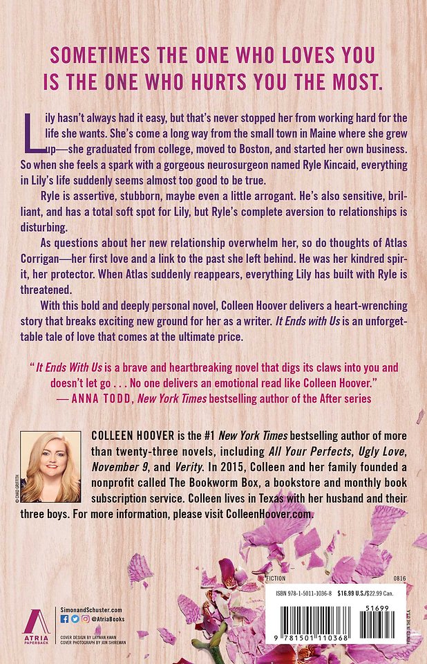 Lily hasn’t always had it easy, but that’s never stopped her from working hard for the life she wants. She’s come a long way from the small town where she grew up—she graduated from college, moved to Boston, and started her own business. And when she feels a spark with a gorgeous neurosurgeon named Ryle Kincaid, everything in Lily’s life seems too good to be true.