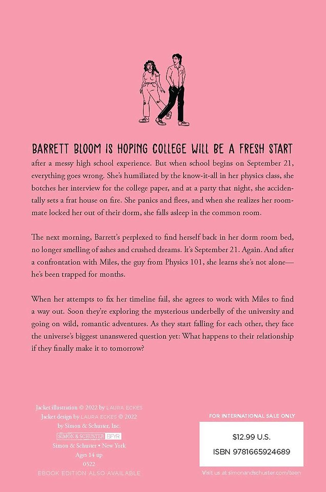 The next morning, Barrett’s perplexed to find herself back in her dorm room bed, no longer smelling of ashes and crushed dreams. It’s September 21st. Again. And after a confrontation with Miles, the guy from Physics 101, she learns she’s not alone—he’s been trapped for months.