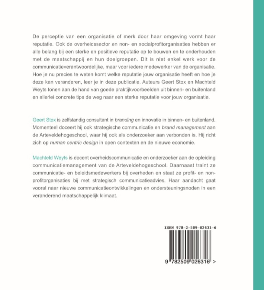 De perceptie van een organisatie of merk door haar omgeving vormt haar reputatie. Ook de overheidssector en non- en social-profitorganisaties hebben er alle belang bij een sterke en positieve reputatie op te bouwen en te onderhouden met de maatschappij en hun doelgroepen. Dat is niet enkel werk voor de communicatieverantwoordelijke, maar voor iedere medewerker van de organisatie. In deze publicatie leert u hoe u nu precies te weten komt welke reputatie uw organisatie heeft en hoe u die kan veranderen. Auteurs Geert Stox en Machteld Weyts tonen aan de hand van goede praktijkvoorbeelden uit binnen- en buitenland en allerlei concrete tips de weg naar een sterke reputatie voor uw organisatie. Dit boek maakt deel uit van de reeks Communicatie i.s.m. KORTOM.