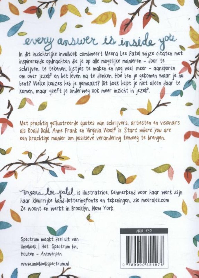 Start where you are is een prachtig geillustreerd invulboek met inspirerende quotes van onder andere Roald Dahl, Anne Frank en Virginia Woolf. Patel geeft op een Keri Smith-achtige manier opdrachten om mindful te worden. Een voorbeeld is de opdracht waar je je favoriete en meest gedurfde droom opschrijft op een stuk papier, dit in een fles stopt en de fles in zee gooit.