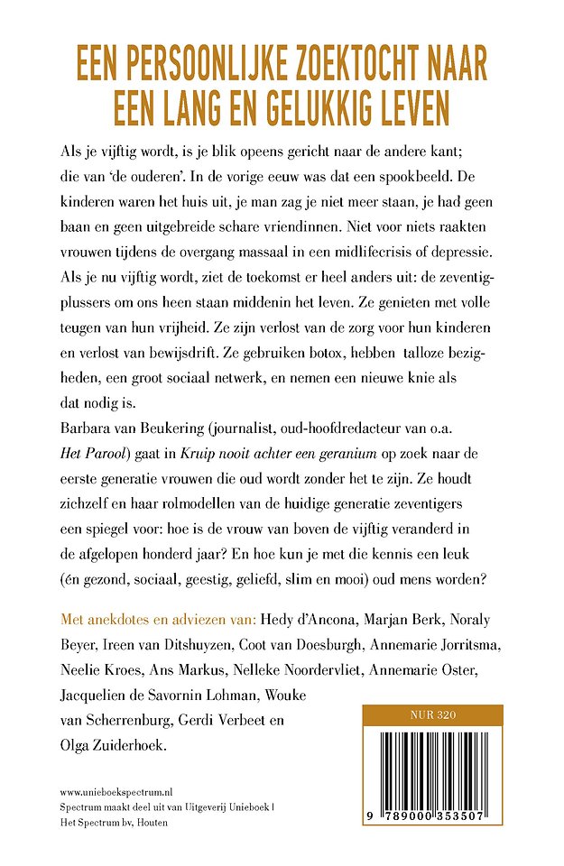 Barbara van Beukering (journalist, oud-hoofdredacteur van o.a. Het Parool) gaat in 'Kruip nooit achter een geranium' op zoek naar de eerste generatie vrouwen die oud wordt zonder het te zijn. Ze houdt zichzelf en haar rolmodellen van de huidige generatie zeventigers een spiegel voor: hoe is de vrouw van boven de vijftig veranderd in de afgelopen honderd jaar? En hoe kun je met die kennis een leuk (én gezond, sociaal, geestig, geliefd, slim en mooi) oud mens worden?