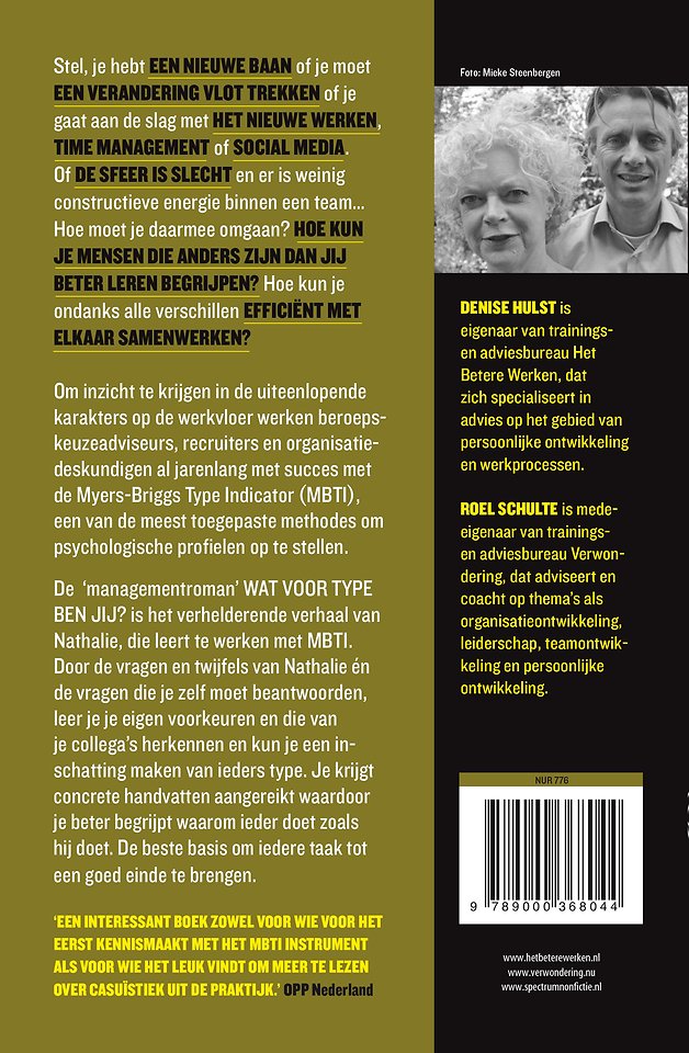 De "managementroman" 'Wat voor type ben jij?' is het verhelderende verhaal van Nathalie, die leert te werken met MBTI. Door de vragen en twijfels van Nathalie én de vragen die u zelf moet beantwoorden, leert u uw eigen voorkeuren en die van uw collega’s herkennen en kunt u een inschatting maken van ieders type. U krijgt concrete handvatten aangereikt waardoor u beter begrijpt waarom ieder doet zoals hij doet. De beste basis om iedere taak tot een goed einde te brengen.