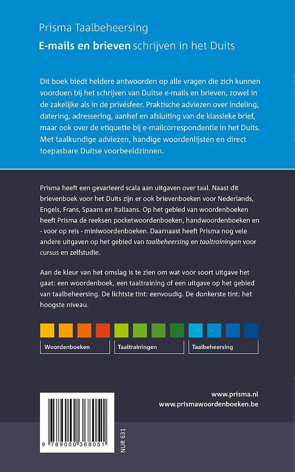 Prisma E-mails en brieven schrijven in het Duits is onderdeel van een reeks instructieboeken voor correspondentie in het Duits, Frans, Engels, Nederlands, Spaans en Italiaans.