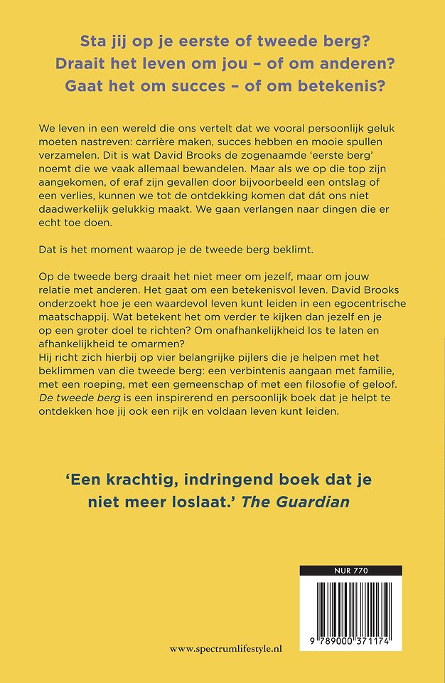 We bewandelen in het leven vaak twee bergen. Bij de eerste berg streven we doelen na als carrière, status en succes. Maar als je de top van die eerste berg hebt bereikt, kan het goed zijn dat je niet van het uitzicht geniet en denkt: is dit alles? Of je dondert van die berg af door iets groots als een ontslag, scheiding of het verlies van een dierbare. Op de tweede berg draait het niet meer om jezelf, maar om anderen. Daar gaat het om het nastreven van een betekenisvol leven. In dit boek onderzoekt David Brooks hoe je die tweede berg kunt beklimmen en zinvol kunt leven in een egocentrische maatschappij. Hij richt zich hierbij op vier belangrijke pijlers die je helpen met het beklimmen van die tweede berg: familie, roeping, filosofie en een gemeenschap.
