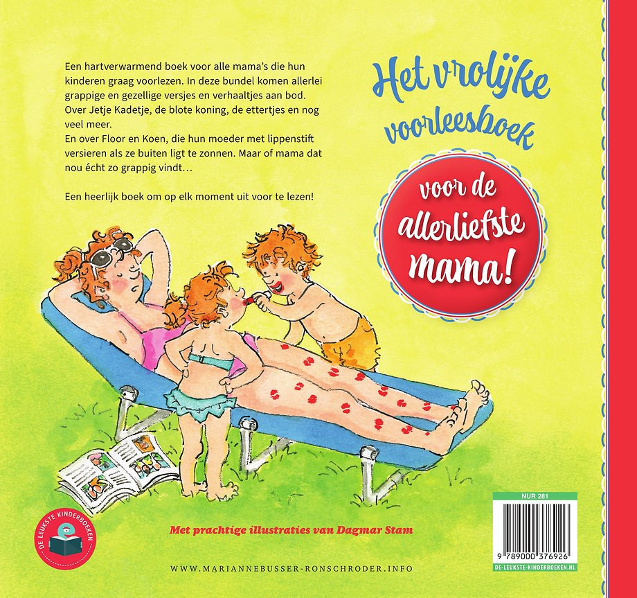 Een hartverwarmend boek voor alle mama’s die hun kinderen graag voorlezen. In deze bundel komen allerlei grappige en gezellige versjes en verhaaltjes aan bod. Over Jetje Kadetje, de blote koning, de ettertjes en nog veel meer. En over Floor en Koen, die hun moeder met lippenstift versieren als ze buiten ligt te zonnen. Maar of mama dat nou écht zo grappig vindt... Een heerlijk boek om op elk moment uit voor te lezen! Vanaf ca. 4 jaar.