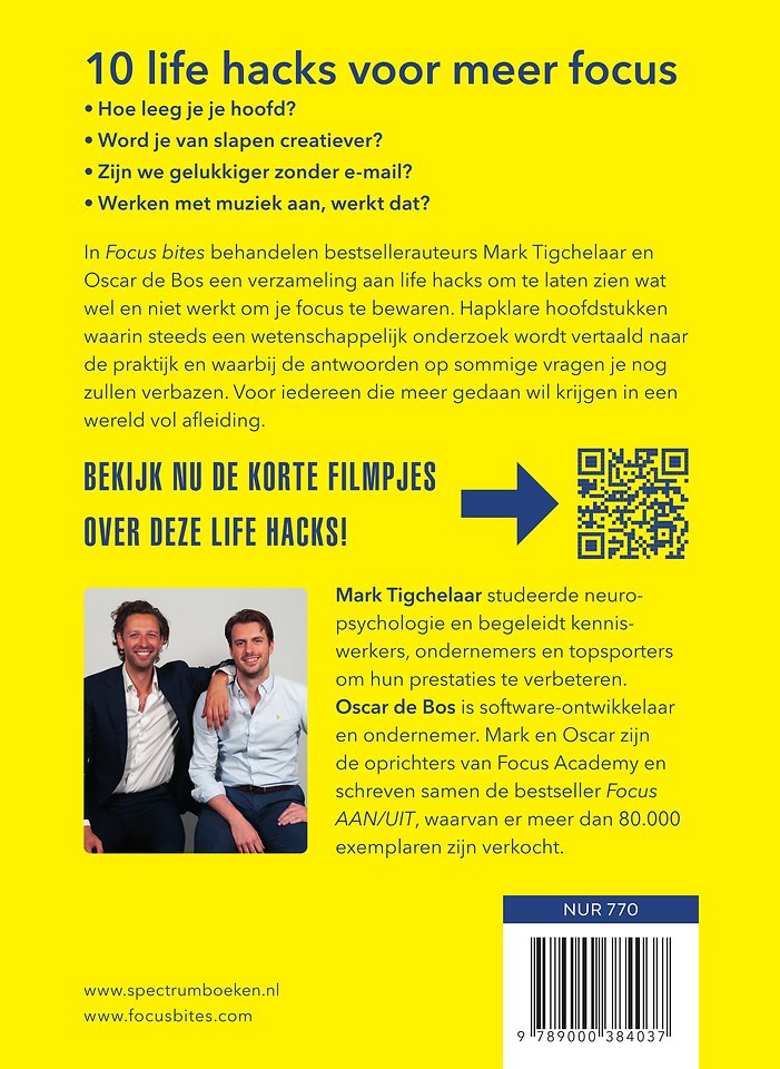 In dit boek behandelen Mark Tigchelaar en Oscar de Bos een verzameling focus bites om te laten zien wat wel en niet werkt om je focus te bewaren. Moet je nu wel of niet werken met muziek aan? Leidt een telefoon af, ook al staat die op stil? Hoe leeg je je hoofd? Is het verstandig om elke dag een glas rode wijn te drinken? Behapbare hoofdstukken waarin steeds een wetenschappelijk onderzoek wordt vertaald naar de prakrijk en waarbij de antwoorden op sommige vragen je nog zullen verbazen.