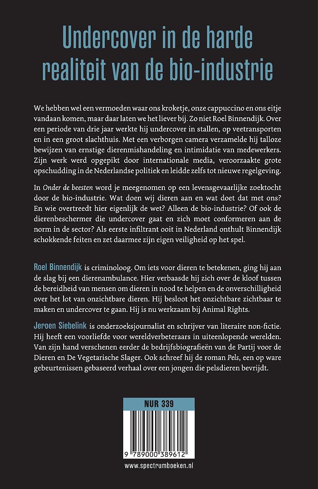In 'Onder de beesten' word je meegenomen op een levensgevaarlijke zoektocht door de bio-industrie. Wat doen wij dieren aan en wat doet dat met ons? En wie overtreedt hier eigenlijk de wet? Alleen de bio-industrie? Of ook de dierenbeschermer die undercover gaat en zich moet conformeren aan de norm in de sector? Als eerste infiltrant ooit in Nederland onthult Binnendijk schokkende feiten en zet daarmee zijn eigen veiligheid op het spel.