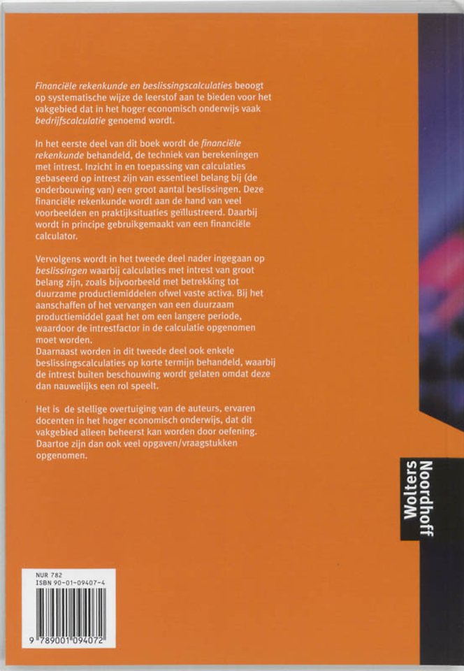 'Financiële rekenkunde en beslissingscalculaties' beoogt op systematische wijze de leerstof aan te bieden voor het vakgebeid dat in het hoger onderwijs vaak bedrijfscalculatie wordt genoemd.