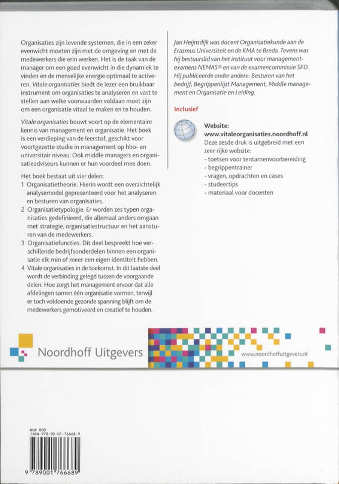 'Vitale organisaties' bouwt voort op de elementaire kennis van management en organisatie. Het boek is een verdieping in de leerstof, geschikt voor voortgezette studie in management op hbo- en universitair niveau. Ook middle managers en organisatieadviseurs kunnen er hun voordeel mee doen.