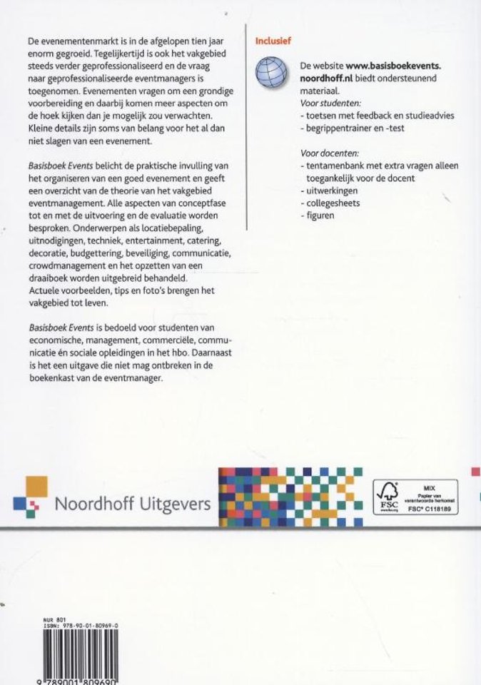 'Basisboek Events' is bedoeld voor studenten van economische, management, commerciële, communicatie én sociale opleidingen in het hbo. Daarnaast is het een uitgave die niet mag ontbreken in de boekenkast van de eventmanager.