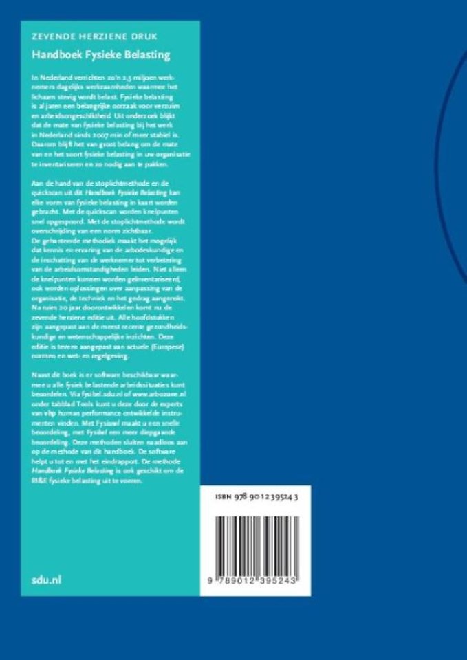 Aan de hand van de stoplichtmethode en de quickscan uit dit Handboek Fysieke Belasting kan elke vorm van fysieke belasting in kaart worden gebracht. Met de quickscan worden knelpunten snel opgespoord. Met de stoplichtmethode wordt overschrijding van een norm zichtbaar. De gehanteerde methodiek maakt het mogelijk dat kennis en ervaring van de arbodeskundige en de inschatting van de werknemer tot verbetering van de arbeidsomstandigheden leiden. Niet alleen de knelpunten kunnen worden geïnventariseerd, ook worden oplossingen over aanpassing van de organisatie, de techniek en het gedrag aangereikt. Na ruim 20 jaar doorontwikkelen komt nu de zevende herziene editie uit. Alle hoofdstukken zijn aangepast aan de meest recente gezondheidskundige en wetenschappelijke inzichten. Deze editie is tevens aangepast aan actuele (Europese) normen en wet- en regelgeving.