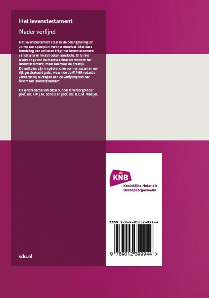 Het levenstestament staat in de belangstelling en vormt een speerpunt van het notariaat. Met deze bundeling van artikelen krijgt het levenstestament vanuit allerlei invalshoeken aandacht. Er is niet alleen oog voor de theorie achter en rondom het levenstestament, maar ook voor de praktijk. De artikelen zijn inspirerend en vormen tezamen een rijk geschakeerd palet, waarmee de WPNR redactie verwacht bij te dragen aan de verfijning van het fenomeen levenstestament.