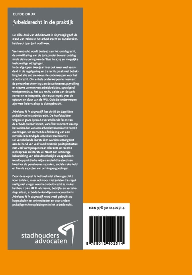 De elfde druk van Arbeidsrecht in de praktijk geeft de stand van zaken in het arbeidsrecht en socialezekerheidsrecht per juni 2018 weer. Veel aandacht wordt besteed aan het ontslagrecht, de ontwikkeling van de jurisprudentie over ontslag sinds de invoering van de Wwz in 2015 en mogelijke toekomstige wijzigingen. In de afgelopen twee jaar is er ook weer veel veranderd in de regelgeving en de rechtspraak met betrekking tot alle andere relevante onderwerpen voor het arbeidsrecht. Om enkele onderwerpen te noemen: de privacybescherming van de werknemer, payrolling en nieuwe vormen van arbeidsrelaties, opvolgend werkgeverschap, het cao-recht, ziekte van de werknemer en re-integratie, de nieuwe regels over de opbouw en duur van de WW. Ook die onderwerpen zijn weer helemaal up-to-date gebracht.