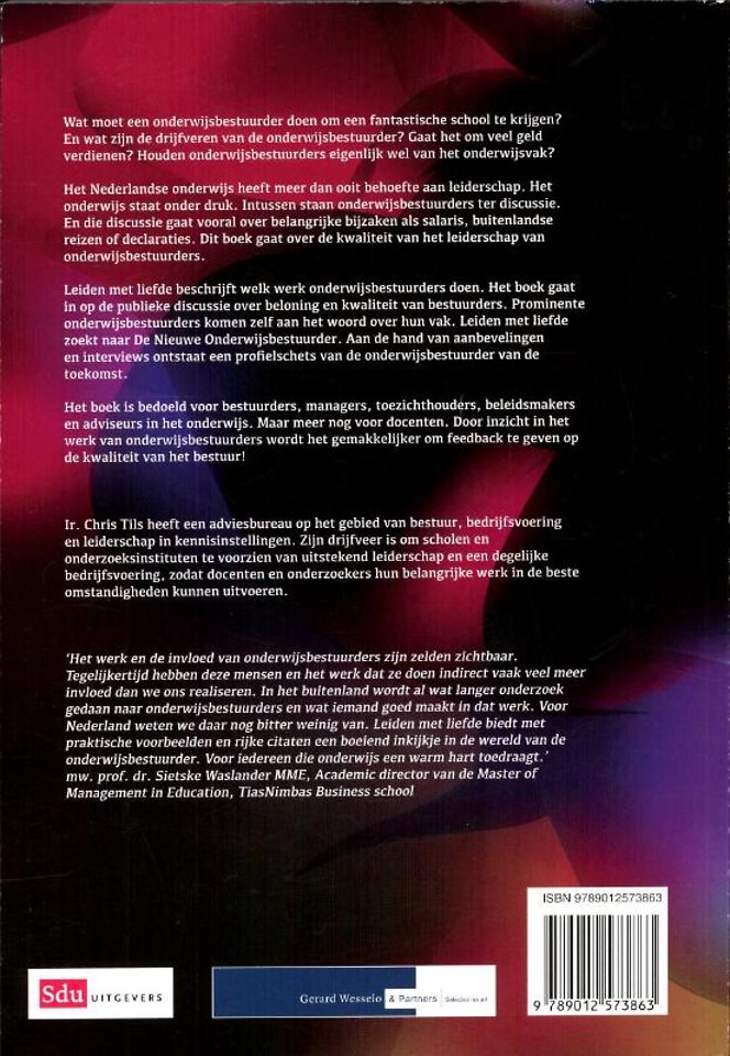 'Leiden met liefde' beschrijft welk werk onderwijsbestuurders doen. Het boek gaat in op de publieke discussies over beloning en kwaliteit van bestuurders. Prominente onderwijsbestuurders komen zelf aan het woord over hun vak. Dr. A.H.G. Rinnooy Kan, voorzitter van de Sociaal-Economische Raad, heeft het voorwoord van 'Leiden met Liefde' geschreven.