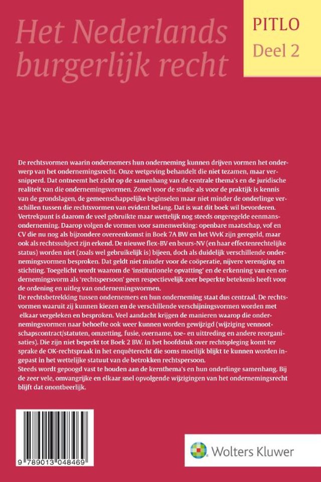 De rechtsvormen waarin ondernemers hun bedrijf kunnen voeren, vormen het onderwerp van het ondernemingsrecht. Onze wetgeving behandelt deze rechtsvormen versnipperd, waardoor het vaak lastig is de samenhang en verschillen van alle ondernemingsvormen inzichtelijk te krijgen. Pitlo 2 - Ondernemingsrecht biedt u dit totaaloverzicht wél.