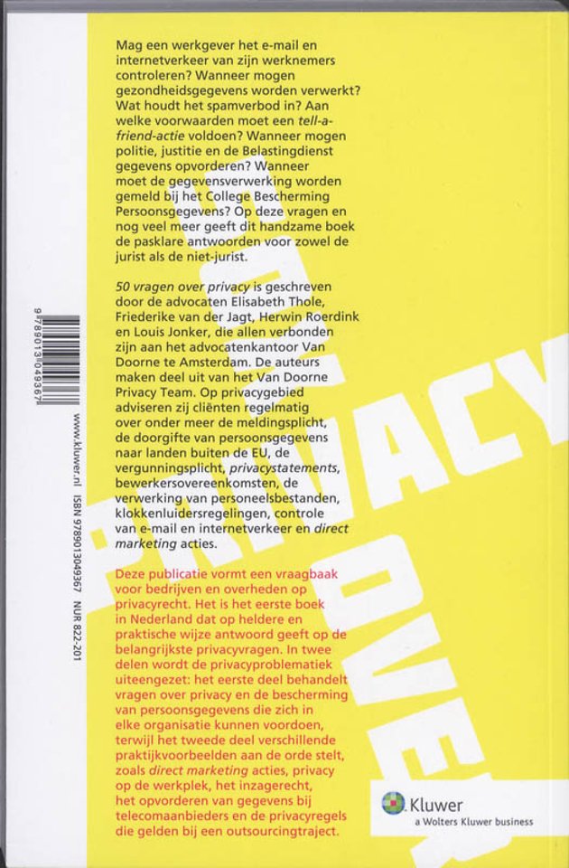 '50 vragen over Privacy' is geschreven door de advocaten Elisabeth Thole, Friederike van der Jagt, Herwin Roerink en Louis Jonker, die allen verbonden zijn aan het advocatenkantoor van Dooren te Amsterdam. De auteurs maken deel uit van het Van Doorne Privacy Team. Op privacygebied adviseren zij cliënten regelmatig over onder meer de meldingsplicht, de doorgifte van persoonsgegevens naar landen buiten de EU, de vergunningsplicht, privacystatements, bewerkersovereenkomsten, de verwerking van personeelsbestanden, klokkenluidersregelingen, controle van e-mail en internetverkeer en direct marketing acties.