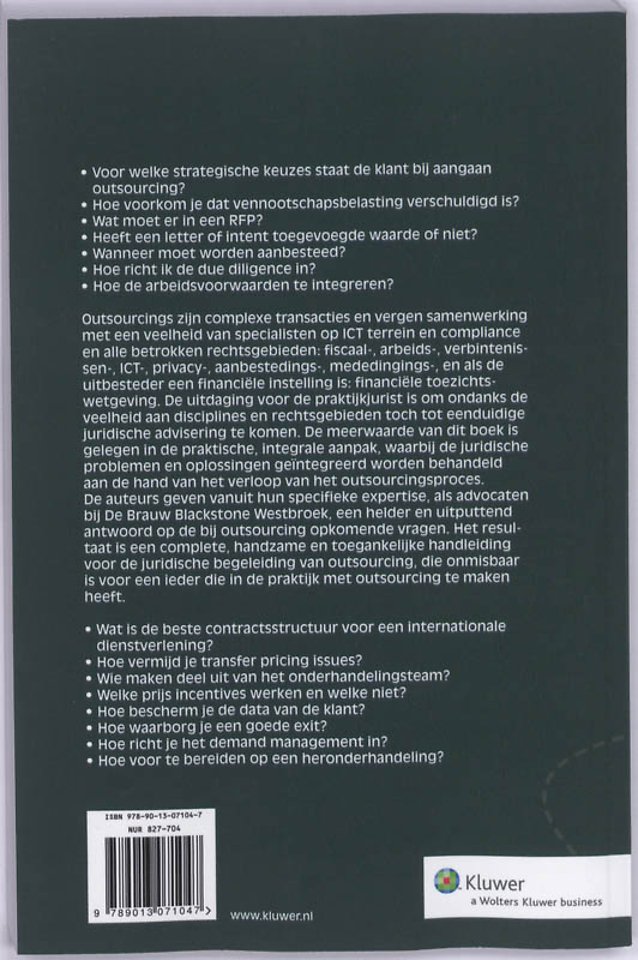 Outsourcings zijn complexe transacties, waarbij kennis is vereist op een veelvoud van juridische terreinen: fiscaal-, arbeids-, verbintenissen-, ICT-, privacy-, aanbestedings-, mededingings- en als de uitbesteder een financiële instelling is: financiële toezichtswetgeving. De uitdaging voor de praktijkjurist is om ondanks de veelheid aan rechtsgebieden tot eenduidige juridische advisering te komen. De meerwaarde van dit boek is gelegen in de praktische, integrale aanpak, waarbij de juridische problemen en oplossingen geïntegreerd worden behandeld aan de hand van het verloop van het outsourcingsproces.