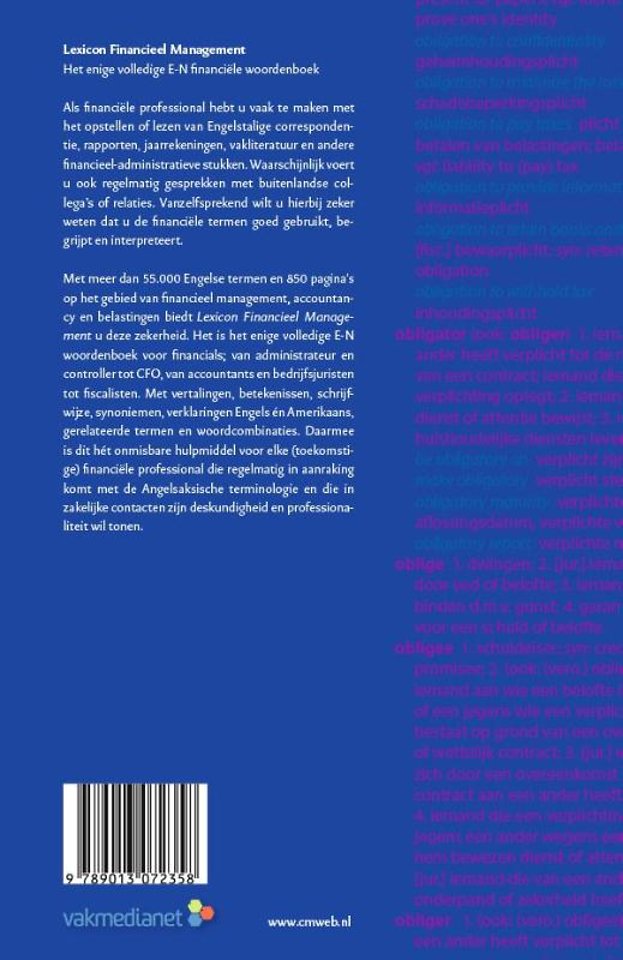 Met meer dan 55.000 Engelse termen en 850 pagina's op het gebied van financieel management, accountancy en belastingen biedt 'Lexicon Financieel Management' u de zekerheid. Het is het enige volledige E-N woordenboek voor financials; van administrateur en controller tot CFO, van accountants en bedrijfsjuristen tot fiscalisten. Met vertalingen, betekenissen, schrijfwijze, synoniemen, verklaringen Engels én Amerikaans, gerelateerde termen en woordcombinaties. Daarmee is dit hét onmisbare hulpmiddel voor elke (toekomstige) financiële professional die regelmatig in aanraking komt met de Angelsaksische terminologie en die in zakelijke contacten zijn deskundigheid en professionaliteit wil tonen.