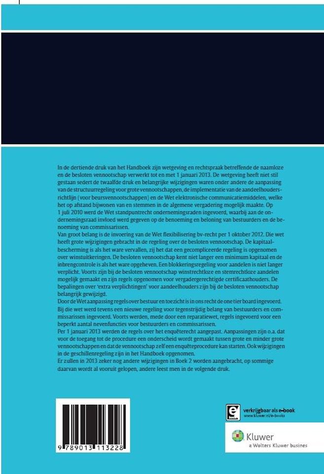 In de dertiende druk van het Handboek zijn wetgeving en rechtspraak betreffende de naamloze en de besloten vennootschap verwerkt tot en met 1 januari 2013. De wetgeving heeft niet stil gestaan sedert de twaalfde druk en belangrijke wijzigingen waren onder andere de aanpassing van de structuurregeling voor grote vennootschappen, de implementatie van de aandeelhouders richtlijn (voor beursvennootschappen) en de Wet elektronische communicatiemiddelen, welke het op afstand bijwonen van en stemmen in de algemene vergadering mogelijk maakte. Op 1 juli 2010 werd de wet standpuntrecht ondernemingsraden ingevoerd, waarbij aan de ondernemingsraad invloed werd gegeven op de benoeming en beloning van bestuurders en de benoeming van commissarissen.Van groot belang is de invoering van de wet flexibilisering bv-recht per 1 oktober 2012. Die wet heeft grote wijzigingen gebracht in de regeling over de besloten vennootschap. De kapitaalbescherming is als het ware vervallen, zij het dat een gecompliceerde regeling is opgenomen over winstuitkeringen. De besloten vennootschap kent niet langer een minimum kapitaal en de inbrengcontrole is als het ware opgeheven. Een blokkeringsregeling voor aandelen is niet langer verplicht.Voorts zijn bij de besloten vennootschap winstrechtloze en stemrechtloze aandelen mogelijk gemaakt en zijn regels opgenomen voor vergadergerechtigde certificaathouders. De bepalingen over "extra verplichtingen" voor aandeelhouders zijn bij de besloten vennootschap belangrijk gewijzigd. Door de wet aanpassing regels over bestuur en toezicht is in ons recht de one tier board ingevoerd. Bij die wet werd tevens een nieuwe regeling voor tegenstrijdig belang van bestuurders en commissarissen ingevoerd. Voorts werden, mede door een reparatiewet, regels ingevoerd voor een beperkt aantal nevenfuncties voor bestuurders en commissarissen.Per 1 januari 2013 werden de regels over het enquêterecht aangepast. Aanpassingen zijn o.a. dat voor de toegang tot de procedure een onderscheid wordt gemaakt tussen grote en minder grote vennootschappen en dat de vennootschap zelf een enquêteprocedure kan starten. Ook wijzigingen in de geschillenregeling zijn in het Handboek opgenomen.