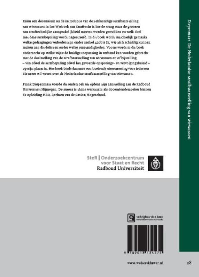 Het aantal witwaszaken neemt jaarlijks toe, waarbij artikel 420bis Sr wordt toegepast in sterk uiteenlopende situaties. Vanaf het begin af aan is er kritiek op de strafbepaling. Met name over de doelstelling van de strafbaarstelling en de reikwijdte van de delictsomschrijving. In 'De Nederlandse strafbaarstelling van witwassen' onderzoekt Frank Diepenmaat onder andere welke gedragingen verboden zijn onder artikel 420bis Sr, wie zich schuldig kunnen maken aan dit delict en onder welke omstandigheden. Behandelt u regelmatig witwaszaken? Dan mag dit leerzame proefschrift niet op uw boekenplank ontbreken.