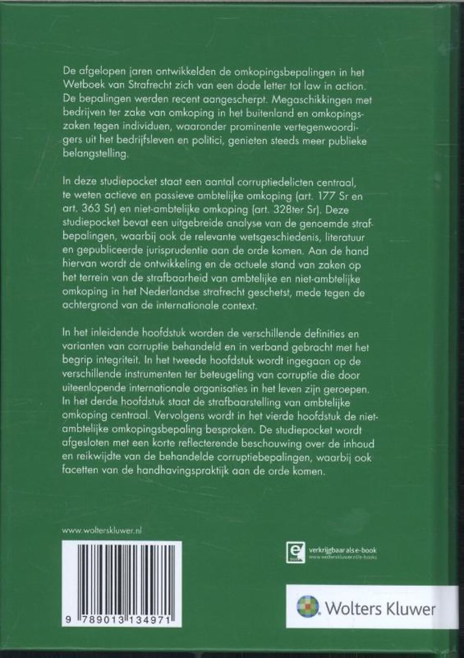 In 'Corruptiedelicten' staat een aantal corruptiedelicten centraal, te weten actieve en passieve ambtelijke omkoping (art. 177 Sr en art. 363 Sr) en niet-ambtelijke omkoping (art. 328ter Sr). Deze studiepocket bevat een uitgebreide analyse van de genoemde strafbepalingen, waarbij ook de relevante wetsgeschiedenis, literatuur en gepubliceerde jurisprudentie aan de orde komen. Aan de hand hiervan wordt de ontwikkeling en de actuele stand van zaken op het terrein van de strafbaarheid van ambtelijke en niet-ambtelijke omkoping in het Nederlandse strafrecht geschetst, mede tegen de achtergrond van de internationale context.