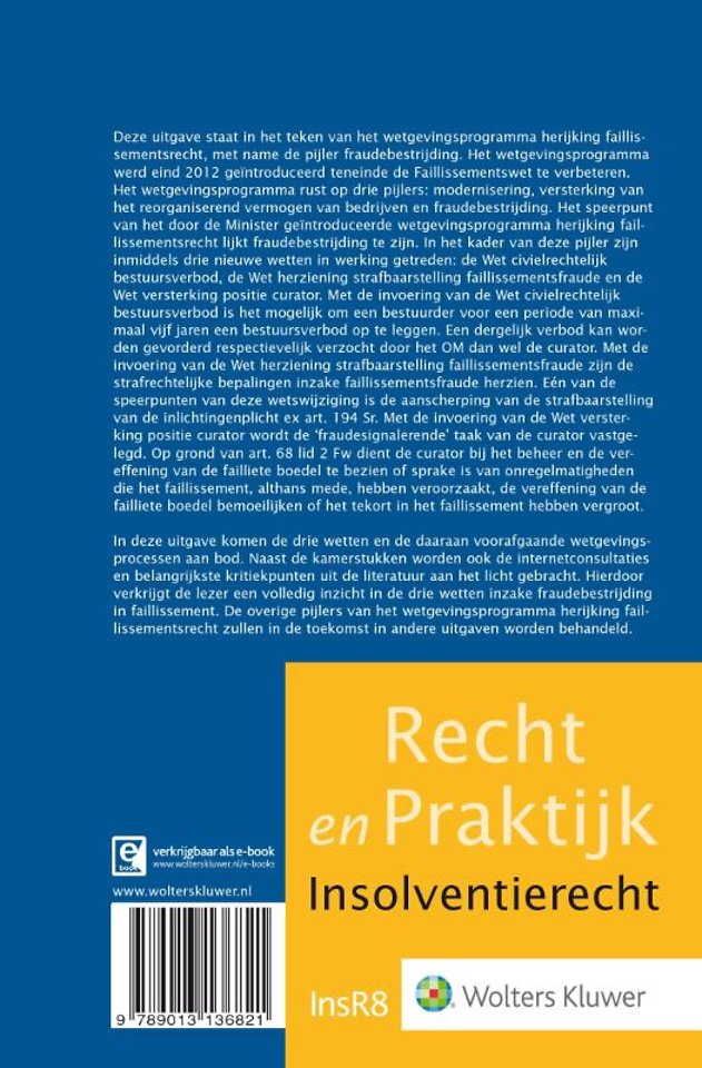 Faillissementsfraude is een hardnekkig probleem. Daarom maakte eind 2012 het wetgevingsprogramma herijking faillissementsrecht haar intrede. Deze uitgave behandelt de pijler fraudebestrijding en de drie wetten die hieruit volgden op fundamenteel en toegepast niveau. Het werk vormt een leidraad voor toepassing van alle nieuwe en gewijzigde bepalingen voor zowel curator, advocaat, rechtelijke macht als student.