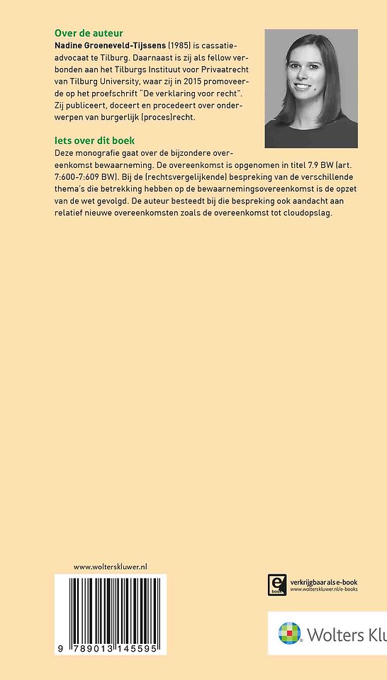 Deze monografie gaat over de bijzondere overeenkomst bewaarneming. In deze uitgave worden de belangrijkste aspecten van dit type overeenkomst besproken aan de hand van binnenlandse en buitenlandse literatuur en rechtspraak. Ook recente maatschappelijke ontwikkelingen zoals de overeenkomst tot cloudopslag komen aan bod.