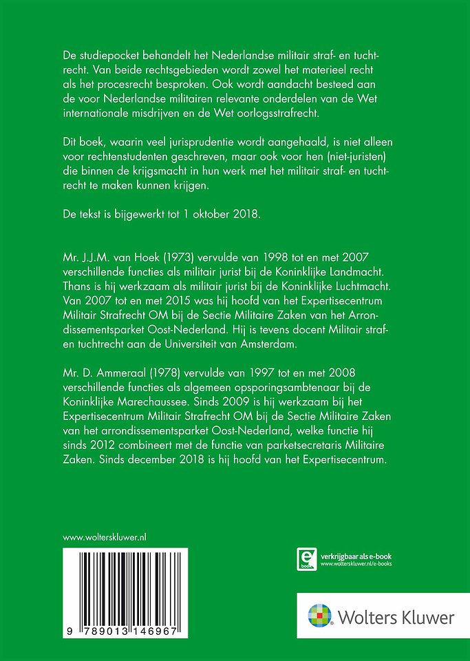Deze studiepocket geeft een compleet overzicht van de straf- en tuchtrechtelijke kaders die gelden voor de krijgsmacht. De lezer krijgt een helder beeld van het Nederlandse militair straf- en tuchtrecht en de voor Nederlandse militairen relevante onderdelen van de Wet internationale misdrijven en de Wet oorlogsstrafrecht.
