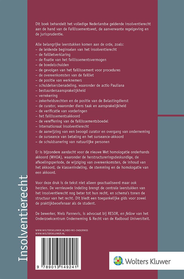 Deze druk is volledig herzien en bijgewerkt met de meest actuele rechtspraak. Alle belangrijke ontwikkelingen en nieuwe wetten komen aan bod, in het bijzonder de WHOA en de WCO I. Verder is de tekst grondig verhelderd en is de hoofdstukindeling gewijzigd, waardoor belangrijke onderwerpen van materieel insolventierecht beter tot hun recht komen. Hierdoor is deze publicatie het enige handzame handboek dat het hele insolventierecht op hoog niveau bespreekt.