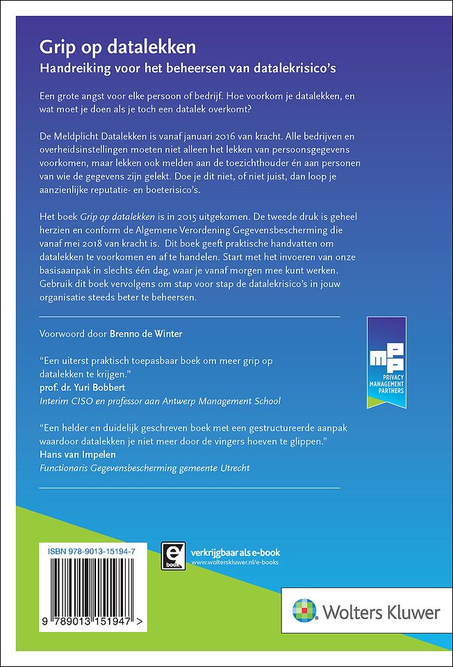 Een datalek kan grote gevolgen hebben voor u als persoon of voor uw bedrijf. Grip op datalekken helpt u om datalekken te voorkomen en, wanneer het noodlot toeslaat, het hoofd te bieden. Deze nieuwe druk is grondig herzien in het licht van de nieuwe Europese privacywet (de AVG) die vorig jaar in werking is getreden.