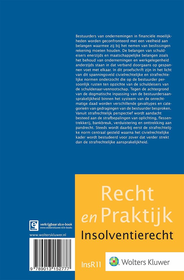 Bestuurders van ondernemingen in financiële moeilijkheden begeven zich in een spanningsveld van verschillende – vaak tegenstrijdige – belangen. Dit proefschrift biedt een geïntegreerde analyse van de civielrechtelijke en strafrechtelijke normen die op de bestuurder persoonlijk rusten ten opzichte van de schuldeisers van de schuldenaar-vennootschap.