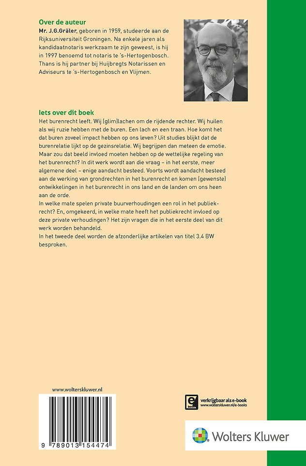 Burenruzies gaan vaak gepaard met veel emotie. Niet gek, nu uit studies blijkt dat de burenrelatie lijkt op de gezinsrelatie. Maar zou dit beeld invloed moeten hebben op wettelijke regelingen van het burenrecht? Deze vraag wordt voor u beantwoord in deze titel. In het verlengde hiervan, buigt de auteur zich over de kwestie in welke mate private buurverhoudingen een rol spelen in het publiekrecht. En, omgekeerd, in welke mate heeft het publiekrecht invloed op deze private verhoudingen?