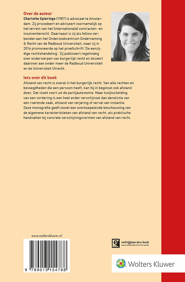Van alle rechten en bevoegdheden die een persoon heeft, kan hij in beginsel ook afstand doen. Dat vloeit voort uit de partijautonomie. Maar kwijtschelding van een vordering is een heel ander verschijnsel dan derelictie van een roerende zaak, afstand van verjaring of verval van instantie. Welke verschillende gedaanten kan afstand aannemen? En welke karakteristieken overstijgen de specifieke verschijningsvormen van afstand? Afstand van recht staat enerzijds stil bij fundamentele vraagstukken, en biedt anderzijds praktische handvatten bij concrete verschijningsvormen van afstand van recht. De monografie vormt daarbij het startpunt voor nader onderzoek naar de werking van specifieke afstandsfiguren.