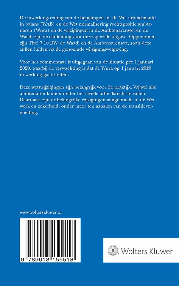 De inwerkingtreding van de bepalingen uit de Wet arbeidsmarkt in balans (Wab) en de Wet normalisering rechtspositie ambtenaren (Wnra) en de wijzigingen in de Ambtenarenwet en de Waadi zijn de aanleiding voor deze speciale uitgave. Opgenomen zijn Titel 7.10 BW, de Waadi en de Ambtenarenwet, zoals deze zullen luiden na de ingang van genoemde wijzigingswetgeving. Voor het commentaar is uitgegaan van de situatie per 1 januari 2020, waarbij de verwachting is dat de Wnra op 1 januari 2020 in werking gaat treden.