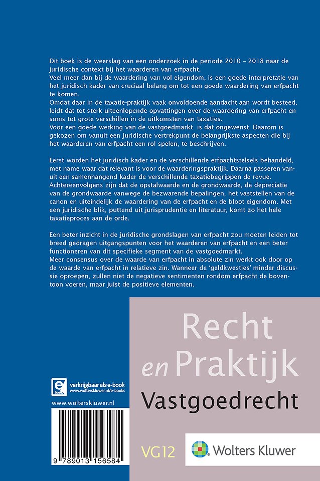 Bent u werkzaam als taxateur, jurist of als professional in de erfpachtpraktijk? Dan krijgt u met deze uitgave een helder beeld van de wijze waarop de juridische aspecten van erfpacht doorwerken in de taxatiepraktijk. U leert ook welk effect de juridische uitgangspunten hebben op het waarderen van erfpacht. In De waarde van erfpacht wordt u met een juridische blik, puttend uit jurisprudentie en literatuur, meegenomen langs het volledige taxatieproces. Eerst worden de verschillende erfpachtstelsels en het juridisch kader behandeld, met name waar dat relevant is voor de waarderingspraktijk. Daarna passeren vanuit een samenhangend kader de verschillende taxatiebegrippen de revue.