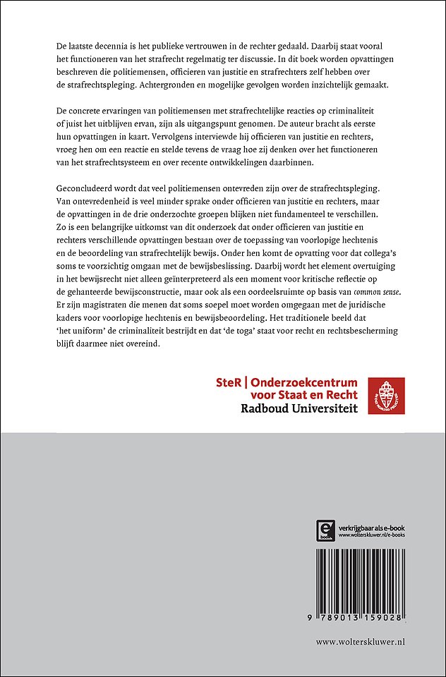 De laatste decennia is het vertrouwen in de rechter gedaald. Hierbij staat vooral het functioneren van het strafrecht ter discussie. Hoe staat het eigenlijk met uw tevredenheid over het strafrechtsysteem? Deze uitgave onderzoekt en beschrijft de heersende opvattingen onder politiemensen, officieren van justitie en strafrechters zelf.
