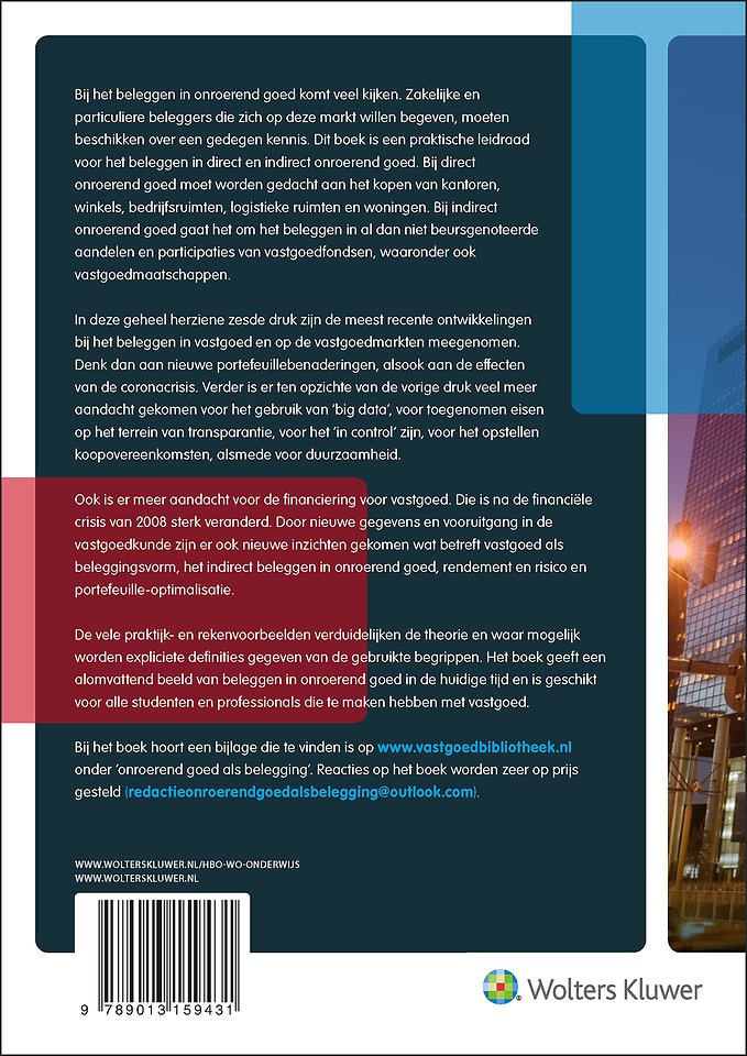 Doordat deze 6e druk ten tijde van de coronacrisis (begin 2020) is geschreven, bevat deze essentiële informatie over de impact hiervan op het beleggen in onroerend goed. Verder is er ten opzichte van de vorige druk veel meer aandacht gekomen voor andere relevante externe factoren, zoals het gebruik van ‘big data’, evenals voor de toegenomen eisen op het terrein van transparantie, het ‘in control’ zijn, het opstellen van eigentijdse koopovereenkomsten en voor het thema duurzaamheid.