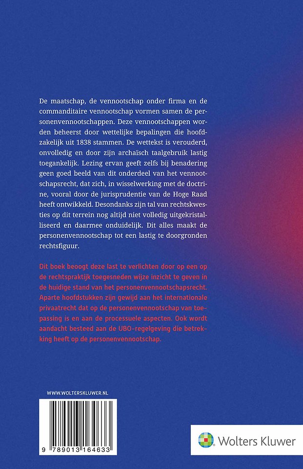 De geactualiseerde uitgave Het Nederlandse personenvennootschapsrecht beoogt deze last te verlichten door, op een wijze die op de rechtspraktijk is toegesneden, inzicht te geven in de huidige stand van het personenvennootschapsrecht. Aparte hoofdstukken zijn gewijd aan het internationale privaatrecht dat op de personenvennootschap van toepassing is en aan de processuele aspecten. Bovendien wordt aandacht besteed aan de UBO-regelgeving die betrekking heeft op de personenvennootschap.