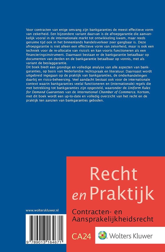 Bankgaranties geeft een up-to-date en volledig overzicht van het recht en de praktijk ten aanzien van bankgaranties, op basis van Nederlandse rechtspraak en literatuur. Er wordt daarnaast ook uitgebreid ingegaan op de bijbehorende onderhandelingen en risicobeheersing. Tevens gaat er veel aandacht naar de internationale context waarin bankgaranties functioneren en de (internationale) regels die met betrekking tot bankgaranties zijn opgesteld. Denk hierbij onder andere aan de Uniform Rules for Demand Guarantees van de International Chamber of Commerce.