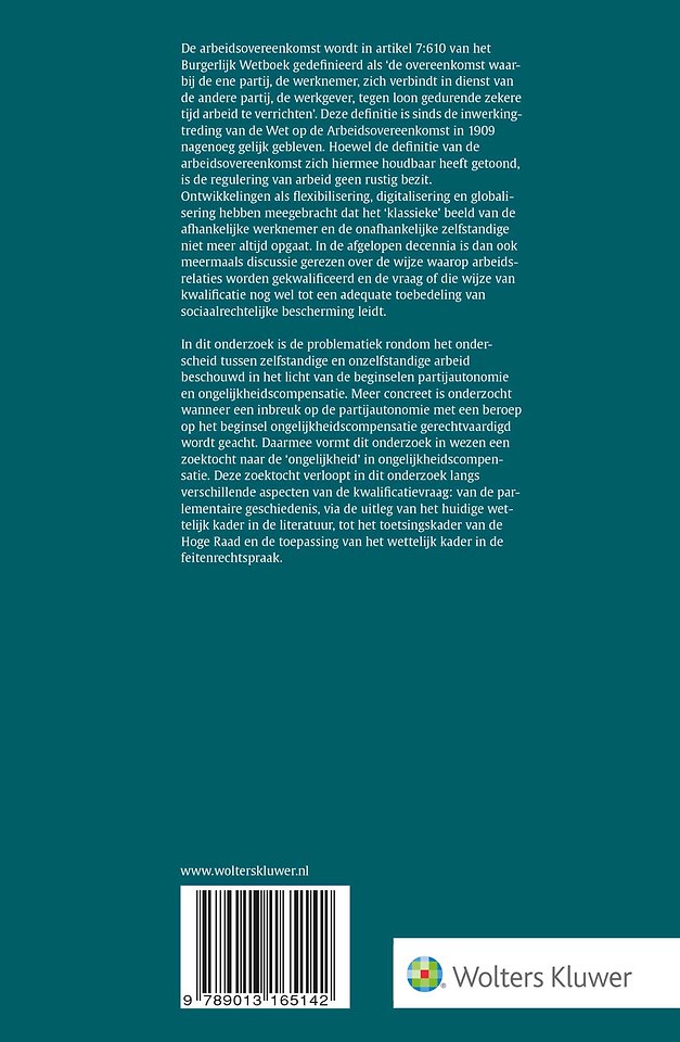 arbeidsrecht en sociale zekerheid kwalificatie arbeidsrelaties arbeidsovereenkomst ongelijkheidscompensatie partijautonomie burgerlijk wetboek jurisprudentieonderzoek schijnzelfstandigheid flexibilisering arbeidsmarkt gezagsverhouding hoge raad rechtspraak zzp platformarbeid contractsvrijheid overeenkomst van opdracht overeenkomst van aanneming holistische benadering fiscaal recht socialezekerheidsrecht tweefasentoets