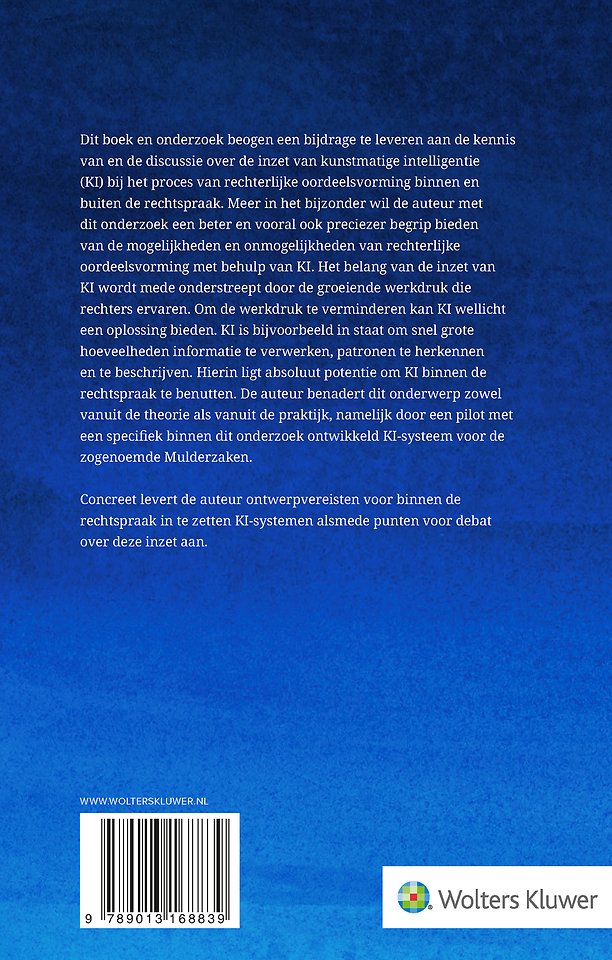 In hoeverre kan kunstmatige intelligentie een rol vervullen bij het proces van rechterlijke oordeelsvorming en welke vereisten gelden bij de betreffende inzet? Deze vraag staat in deze titel centraal en wordt vanuit verschillende invalshoeken bestudeerd. De publicatie beoogt hiermee een bijdrage te leveren aan de kennis van en de discussie over de inzet van kunstmatige intelligentie (KI) bij het proces van rechterlijke oordeelsvorming binnen en buiten de rechtspraak.