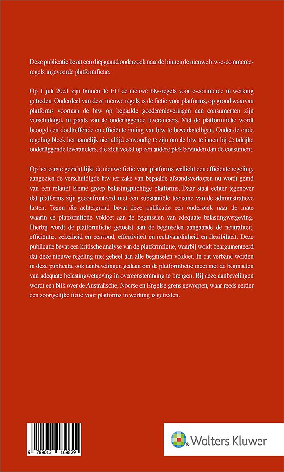Deze uitgave sluit aan bij diverse actuele ontwikkelingen wat betreft e-commerce en handel via het internet, platformeconomie en technologie. De titel is onmisbaar voor een diepgaande analyse van de platformfictie ten opzichte van de beginselen van adequate belastingwetgeving, zoals de neutraliteit, efficiëntie, zekerheid en eenvoud, effectiviteit en rechtvaardigheid en flexibiliteit. De publicatie bevat aanbevelingen om de platformfictie vollediger met de beginselen in overeenstemming te brengen. Hierbij wordt ook een blik geworpen over de Australische, Noorse en Engelse grens, waar al eerder een soortgelijke fictie voor platforms in werking is getreden.