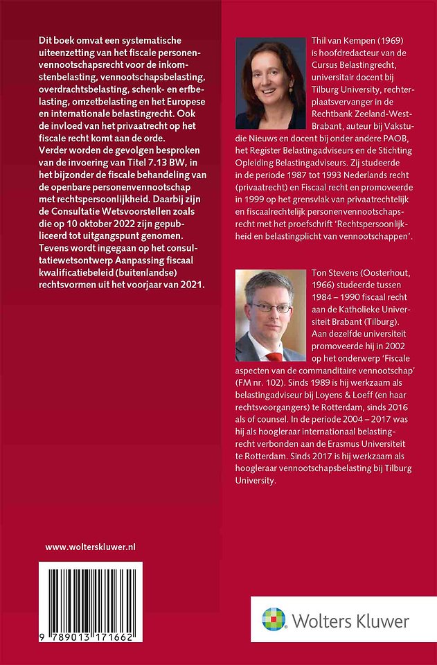 Dit boek omvat een systematische uiteenzetting van het fiscale personenvennootschapsrecht voor de inkomstenbelasting, schenk- en erfbelasting, omzetbelasting en het Europese en internationale belastingrecht. Ook de invloed van het privaatrecht op het fiscale recht komt aan de orde.